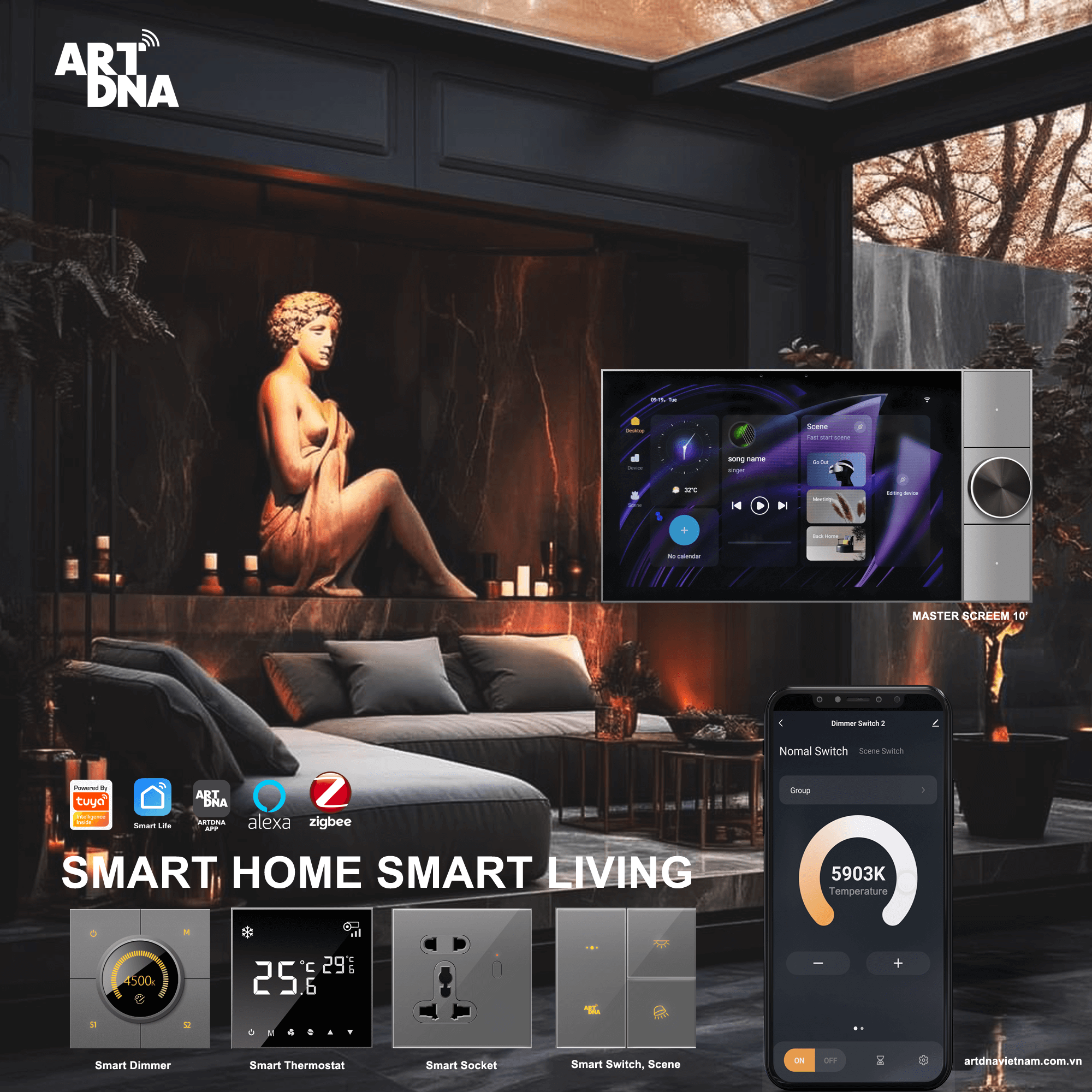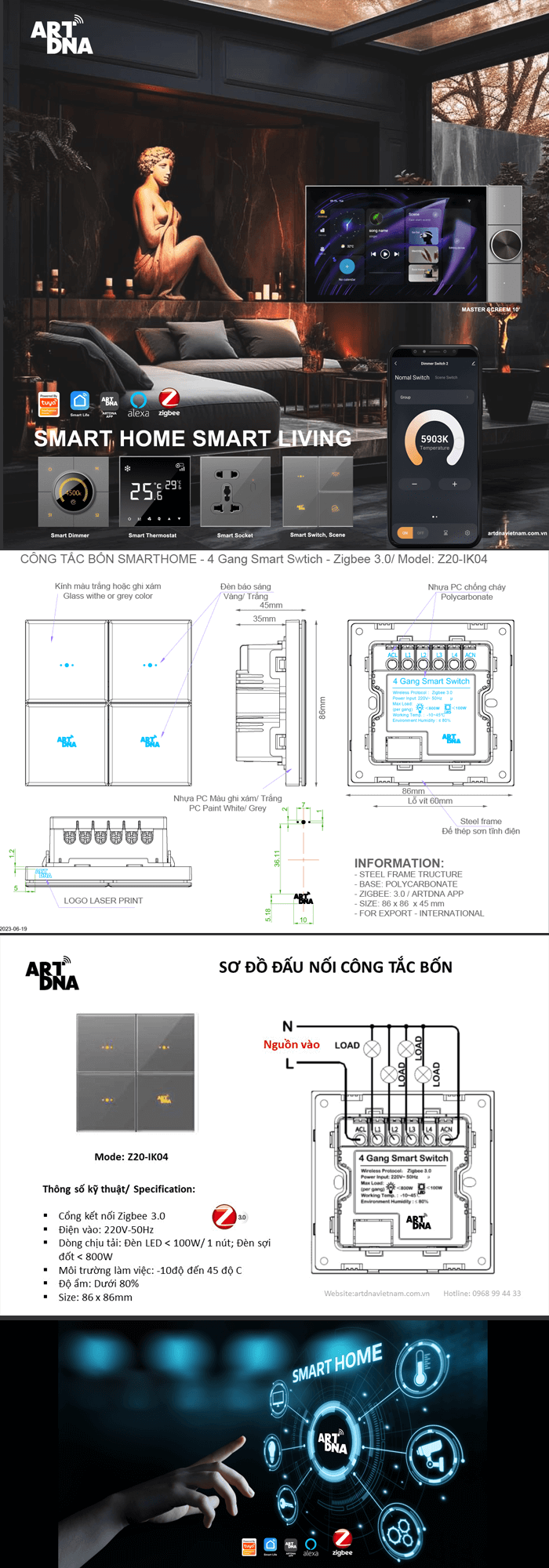 ARTDNA sử dụng công nghệ Zigbee 3.0 điều khiển thông minh qua APP của ARTDNA. Sử dụng chip LED của Mỹ