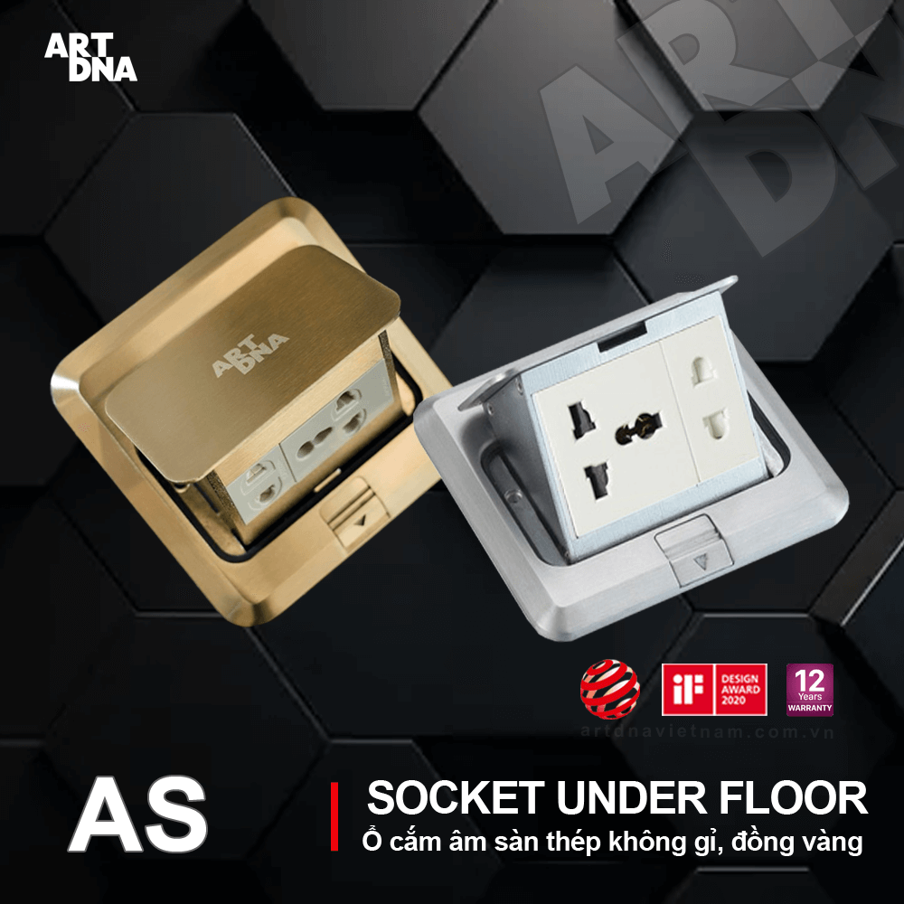 Ổ cắm âm sàn ARTDNA, tiêu chuẩn GERMANY, Chất liệu bằng đế thép, mặt đồng vàng cao cấp nguyên khối, Bảo hành 3 năm, chịu lực tốt